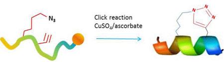 The high efficiency and mild conditions of “click” reaction (Copper catalyzed Huisgen 1,3-dipolar cycloaddition reaction) combined with the ease of synthesis of the necessary unnatural amino acids allows for facile synthesis of triazole-stapled peptides. For example, a combination of L-Nle(εN3) and D-Pra (D-Propargylalanine) substituted at the i and i+4 positions can be used for the generation of single triazole-stapled peptides.